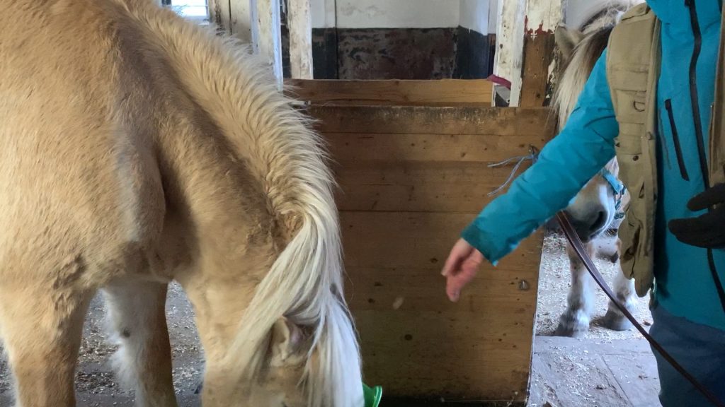 Durch das wechselnde Wetter durfte ich täglich neu überlegen, wie und wo ich die Ponys füttere: Bei zu viel Frost sind die Heunetze so gefroren, dass kein Heu mehr rauszubekommen war. Also habe ich loses Heu am Boden gefüttert. Bei zu viel Sturm fliegt das lose Heu schneller weg als die Ponies fressen können, wieder im Netz füttern. Und wenn der Schnee gerade wieder getaut ist, steht das Wasser am Boden und die Ponies wünschen trockenes, sauberes Heu im hängenden Netz. Hier besteht noch Optimierungspotential für den nächsten Winter.