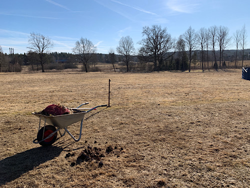 Mittagspause: Meditatives Misteinsammeln. Sonne genießen, Bewegung an der frischen Luft. Gut dass ich täglich draußen zu tun habe. Sonst bin ich ein Stubenhocker, die mit einem Buch wunderbar die Zeit vergißt. Zwei Schubkarren Mist bekomme ich täglich zum Einsammeln nachgeliefert. Und heute habe ich mir auch noch die Zeit genommen, ein Wenig mit den Ponies zu trainieren. Davon ein anderes Mal mehr.
