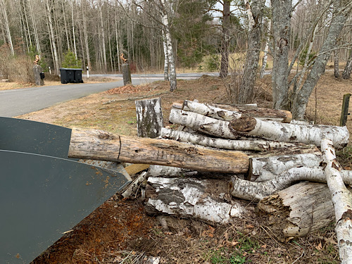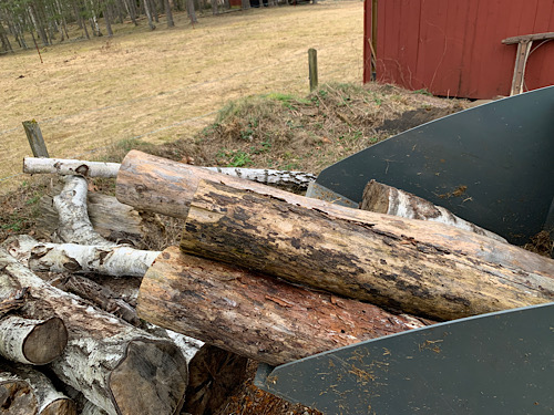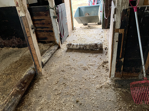 Noch etwas Produktives an einem Samtag: Birkenstämme sollen helfen die Holzspäne im Stall zu halten. Die Ponies heben die Füße nicht und verteilen die Späne überall bis aus dem Stall heraus. Jetzt hoffe ich, dass meine Idee mit den Stämmen zum einen die Späne etwas fixiert und zum anderen die Ponies die Füße heben müssen. Dafür auch das Querholz im Eingang. Dem Traktor sei Dank ist das ganze gut zu schaffen.