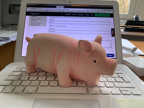 Obwohl Samstag ist verbringe ich wieder einige Zeit am Computer. Unter anderem brauche ich ein Programm, dass mir bei meiner eigenen Buchhaltung in Schweden hilft. Und bevor der Frust zu groß wird, darf das Schwein ein bißchen grunzen. Das ist viel zu Schade als Hundespielzeug.