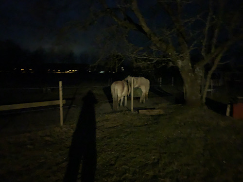 Nächtliche Raubtierfütterung. Damit die Fresspause nicht zu lang wird, bringe ich vor dem Schlafengehen den Ponies noch einen Sack Heu. Im Gegensatz zu den wirklichen Raubtieren, ist die Verdauung der Pferde nicht auf lange Pausen ausgelegt. Derzeit finden Sie in dem kleinen Auslauf, den ich ihnen aktuell zugeteilt habe um die Wiese zu schonen, nichts mehr als Ergänzung. Daher muss ich die Pause so kurz wie möglich halten (und will als Mensch aber nachts durch schlafen).
