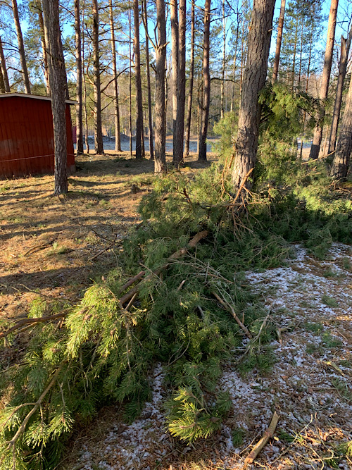 Abgerissene Kiefern in meinem kleinen Wald – neben dem Heuschuppen, neben dem Zaun, durchgefallen bis auf den Boden. Schade um die Bäume, aber zumindest nichts kaputt und keine Gefahr mehr